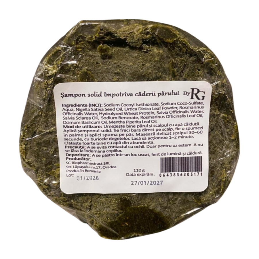 Compoziție (INCI): Sodium Cocoyl Isethionate, Sodium Coco-Sulfate, Aqua, Nigella Sativa Seed Oil, Urtica Dioica Leaf Powder, Rosmarinus Officinalis Water, Hydrolyzed Wheat Protein, Salvia Officinalis Water, Salvia Sclarea Oil, Sodium Benzoate, Rosmarinus Officinalis Leaf Oil, Ocimum Basilicum Oil, Mentha Piperita Leaf Oil.
